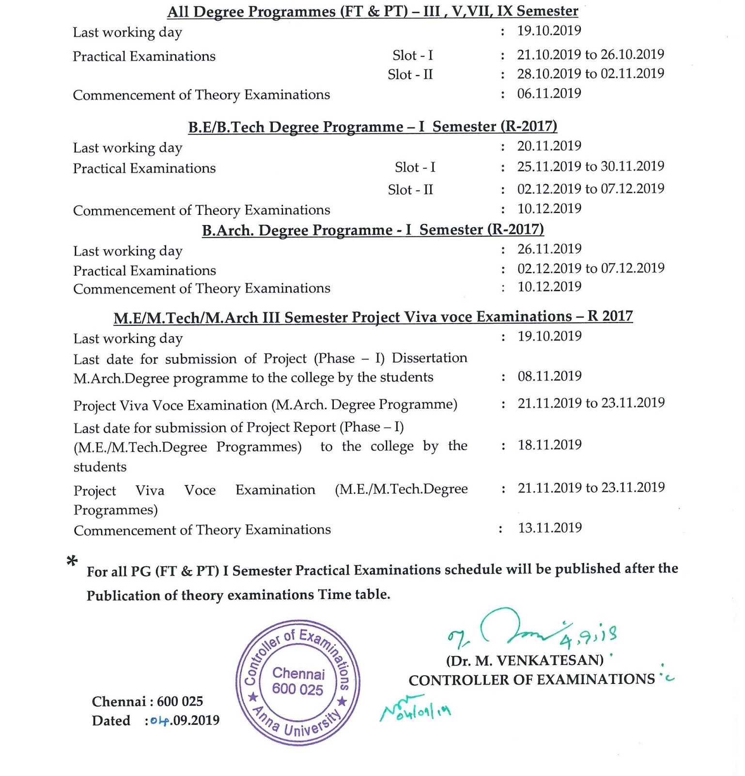 It is Informed That the November / December 2019 Theory Exam , Practical Exams and Project Viva Voce Examination for B.E , B. Tech, B. Arch, M.Sc, MBA, M.C.A, M.E, M. Tech, M. Arch Programmes are Scheduled to Be Held as Detailed below