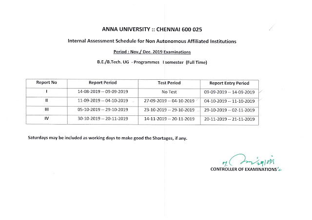 Kind Attention to the Institutions: – Academic and Assessment Schedule – Nov./Dec. 2019 – First Semester (UG-Full Time)